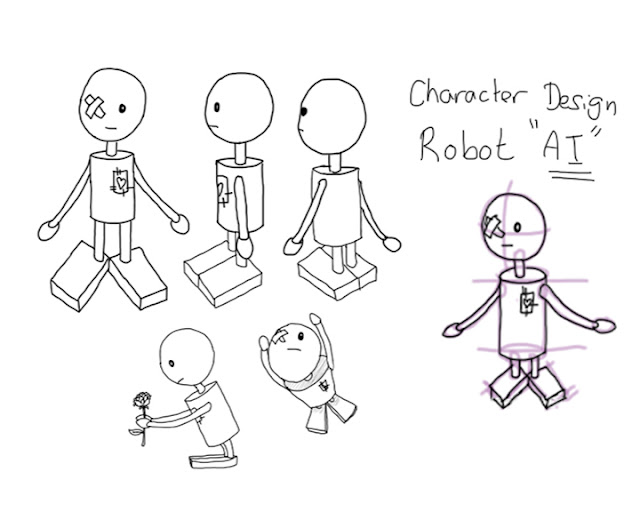 "Robot AI". The name came from the Japanese word, Ai means 'Love'. Also it reflects the word 'I' in English as well. He is a lonely Robot who wants to be loved. He is a gentle, nature-loving Robot and peace-hoping character. He learns to walk by observing people walking across his house. He learns how to jump, how to sit, and also he learns what 'love' is.